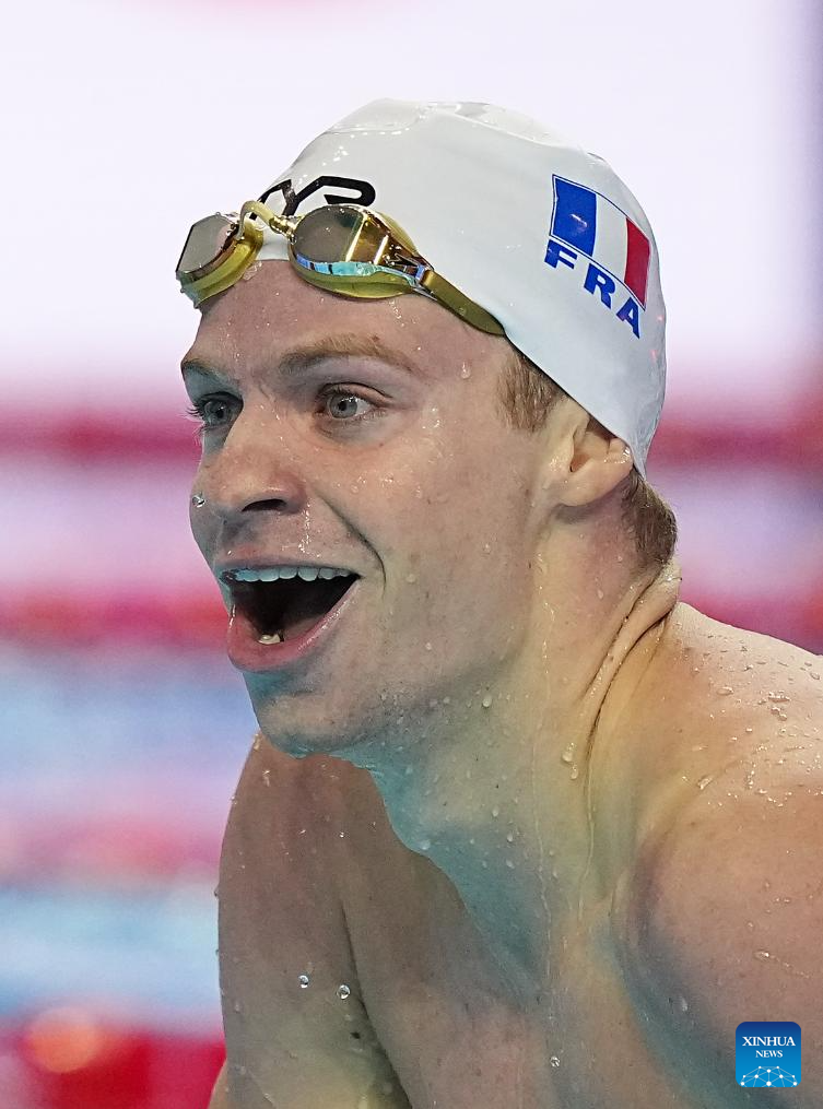 Leon Marchand of France celebrates after the men's 200m individual medley semifinal of swimming at the World Aquatics Championships in Singapore, July 30, 2025. (Xinhua/Xia Yifang)