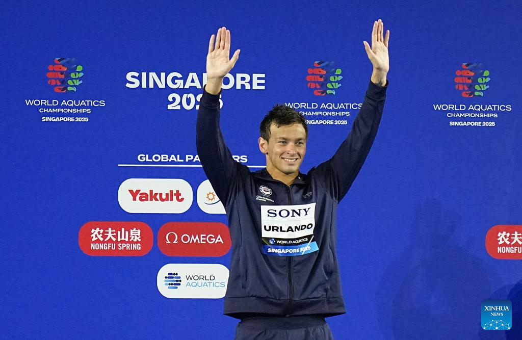 Luca Urlando of the United States waves to the spectators during the awarding ceremony for the men's 200m butterfly final of swimming at the World Aquatics Championships in Singapore, July 30, 2025. (Xinhua/Xia Yifang)