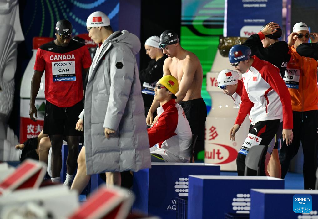 Team China's Xu Jiayu, Qin Haiyang, Zhang Yufei and Wu Qingfeng (L to R) are seen before the mixed 4x100m medley relay final of swimming at the World Aquatics Championships in Singapore, July 30, 2025. (Xinhua/Xue Yuge)