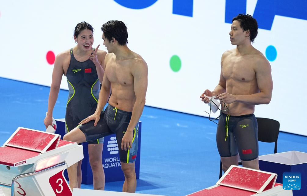 Team China's Zhang Yufei, Xu Jiayu and Qin Haiyang (L to R) are seen after the mixed 4x100m medley relay final of swimming at the World Aquatics Championships in Singapore, July 30, 2025. (Xinhua/Xue Yuge)
