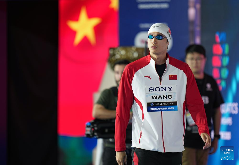 Wang Shun of China is seen before the men's 200m individual medley semifinal of swimming at the World Aquatics Championships in Singapore, July 30, 2025. (Xinhua/Xia Yifang)
