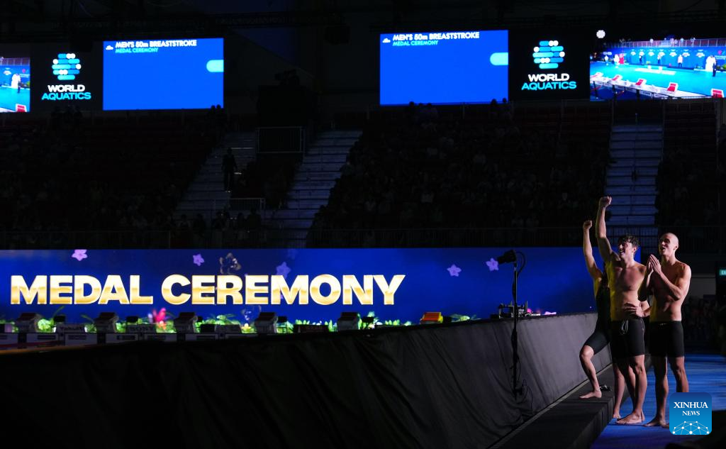 Medalists pose during the awarding ceremony for the men's 50m breaststroke final of swimming at the World Aquatics Championships in Singapore, July 30, 2025. (Xinhua/Xia Yifang)