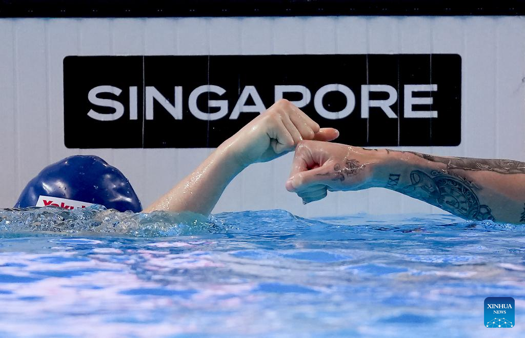 Pan Zhanle (L) of China greets Kyle Chalmers of Australia after the men's 100m freestyle semifinal of swimming at the World Aquatics Championships in Singapore, July 30, 2025. (Xinhua/Wu Zhizun)