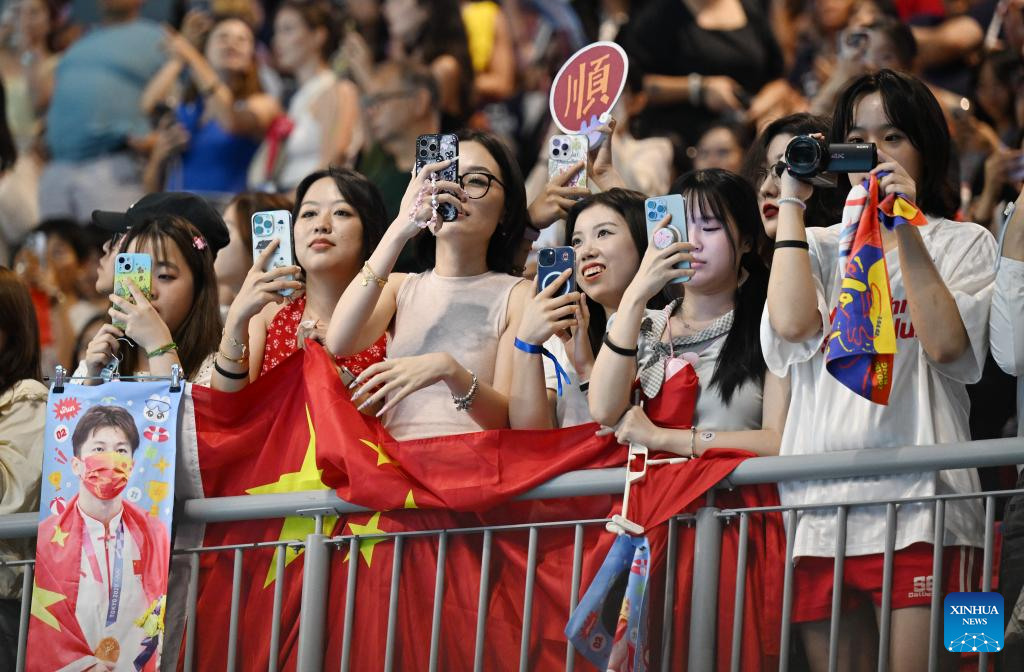 Supporters of China's Wang Shun cheer for him during the men's 200m individual medley semifinal of swimming at the World Aquatics Championships in Singapore, July 30, 2025. (Xinhua/Xia Yifang)