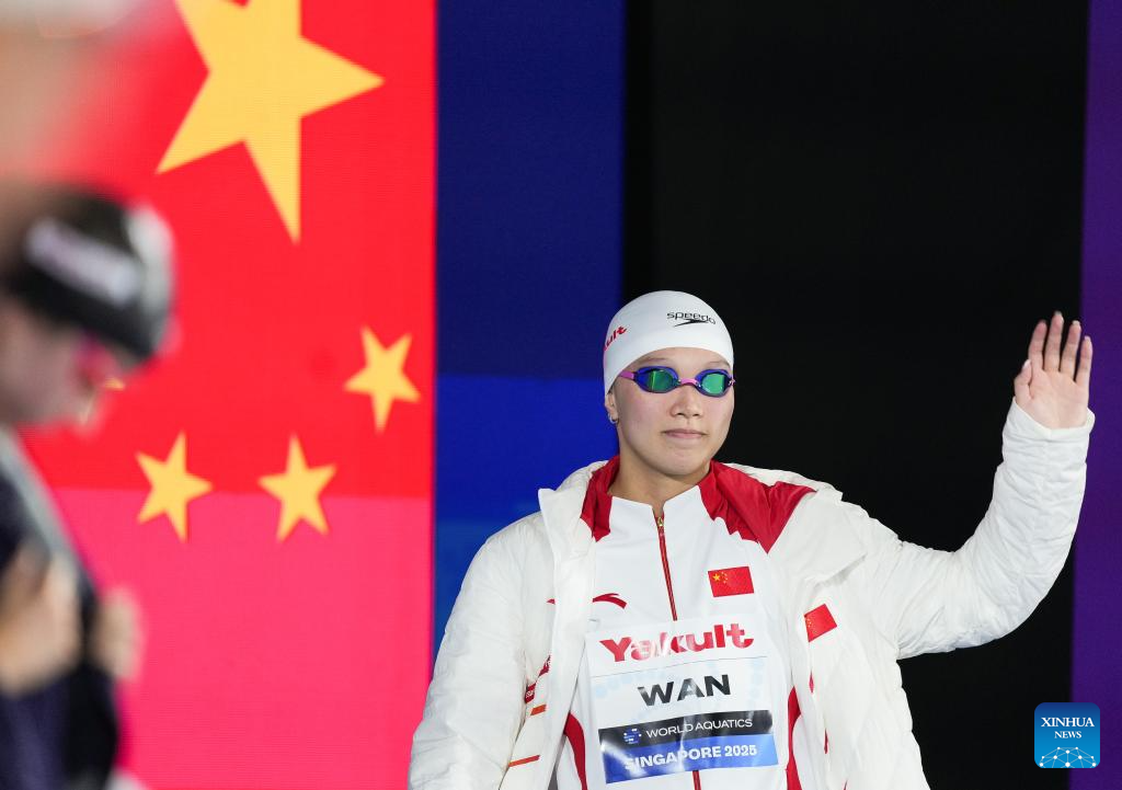 Wan Letian of China waves to the spectators before the women's 50m backstroke semifinal of swimming at the World Aquatics Championships in Singapore, July 30, 2025. (Xinhua/Wu Zhizun)
