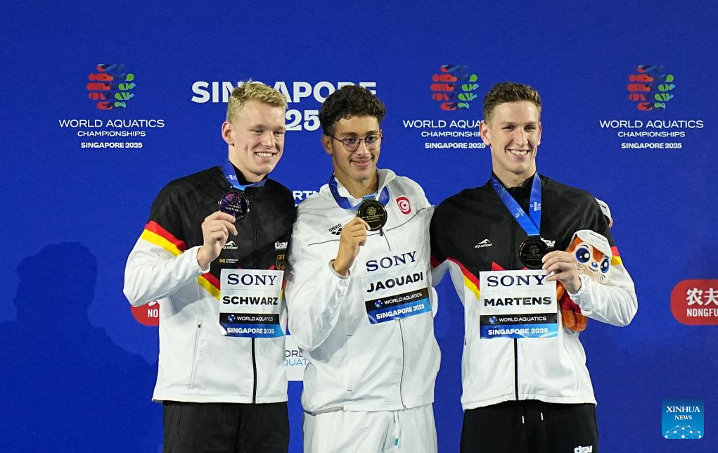 Gold medalist Ahmed Jaouadi (C) of Tunisia, silver medalist Sven Schwarz (L) of Germany and bronze medalist Lukas Maertens of Germany pose during the awarding ceremony for the men's 800m freestyle final of swimming at the World Aquatics Championships in Singapore, July 30, 2025. (Xinhua/Xia Yifang)