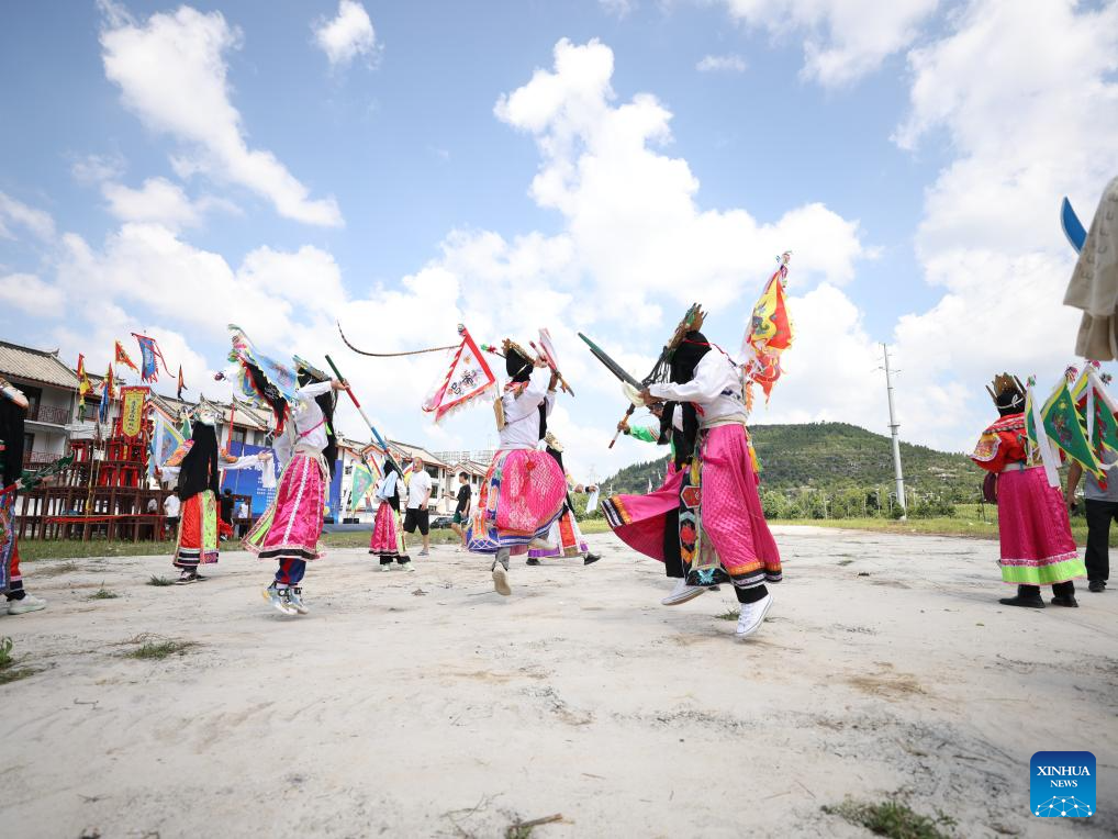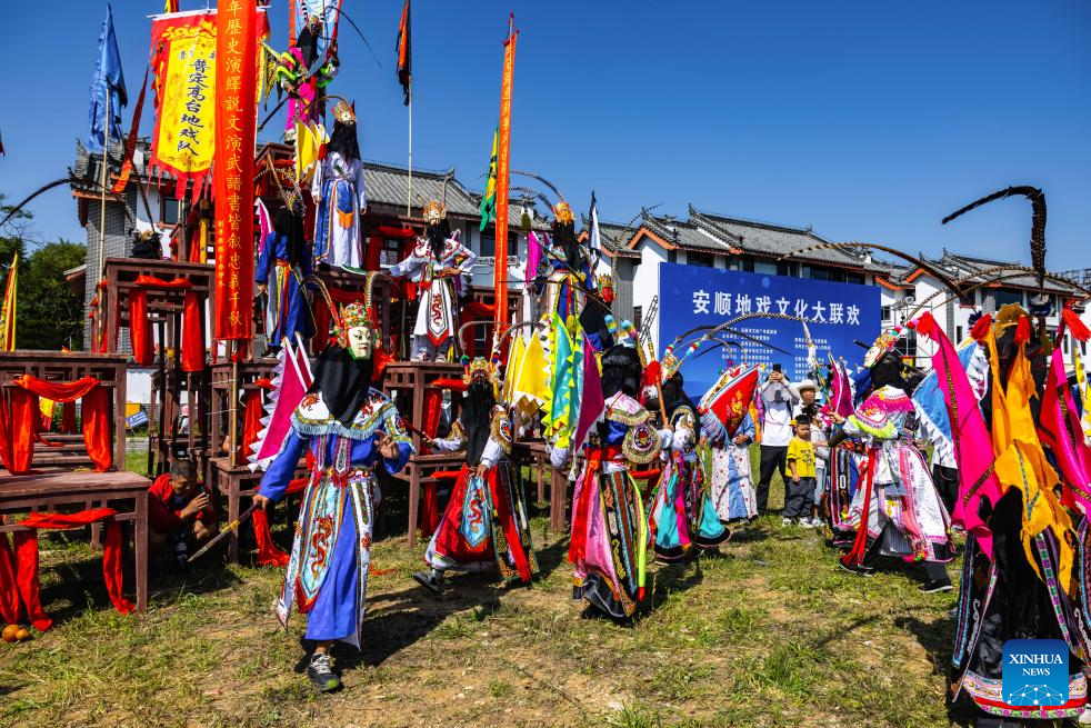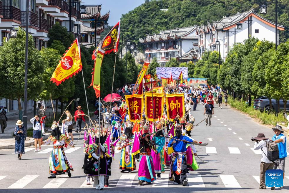 Actors take part in a Dixi opera parade at the Miaoling Tunpu scenic area in Xixiu District of Anshun City, southwest China's Guizhou Province, Aug. 2, 2025. Anshun Dixi Opera is an important part of Tunpu culture dating back to the Ming Dynasty (1368-1644). The opera has been listed as a national intangible cultural heritage item in 2006. (Photo by Fan Hui/Xinhua)