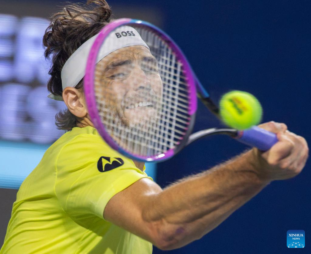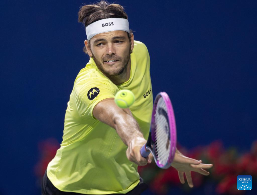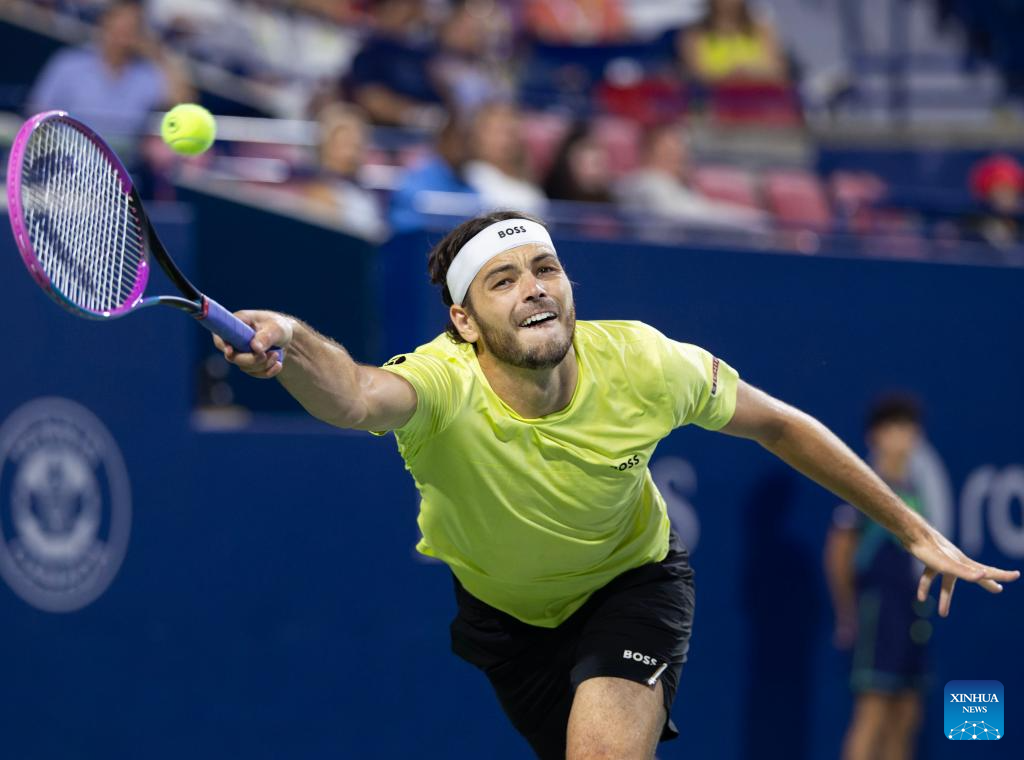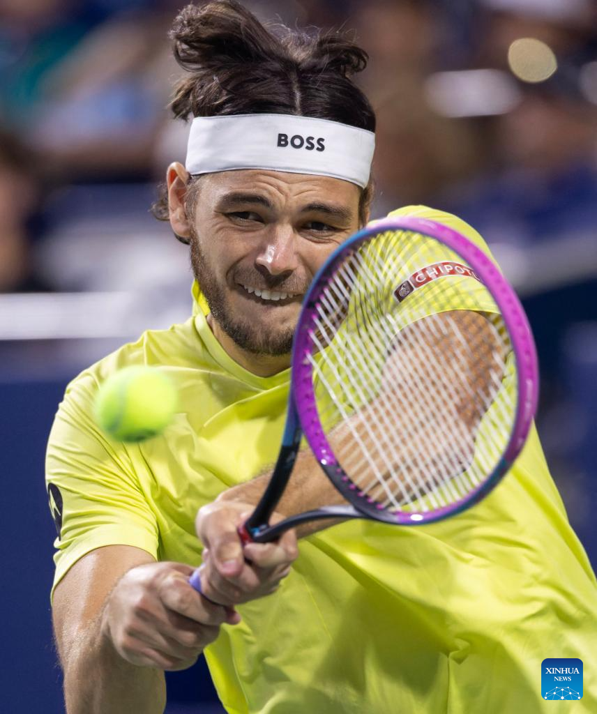 Taylor Fritz returns the ball during the men's singles round of 16 match between Jiri Lehecka of the Czech Republic and Taylor Fritz of the United States at the 2025 National Bank Open tennis tournament in Toronto, Canada, Aug. 3, 2025. (Photo by Zou Zheng/Xinhua)