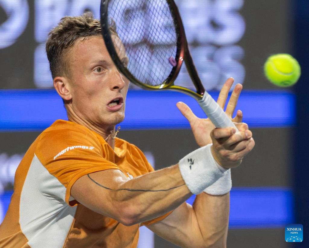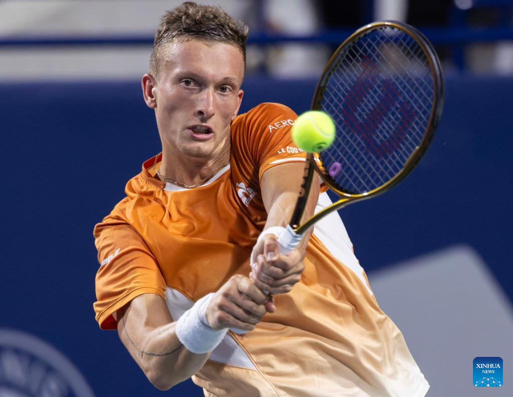 Jiri Lehecka returns the ball during the men's singles round of 16 match between Jiri Lehecka of the Czech Republic and Taylor Fritz of the United States at the 2025 National Bank Open tennis tournament in Toronto, Canada, Aug. 3, 2025. (Photo by Zou Zheng/Xinhua)