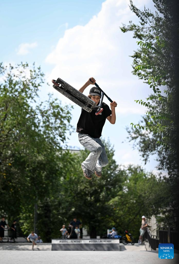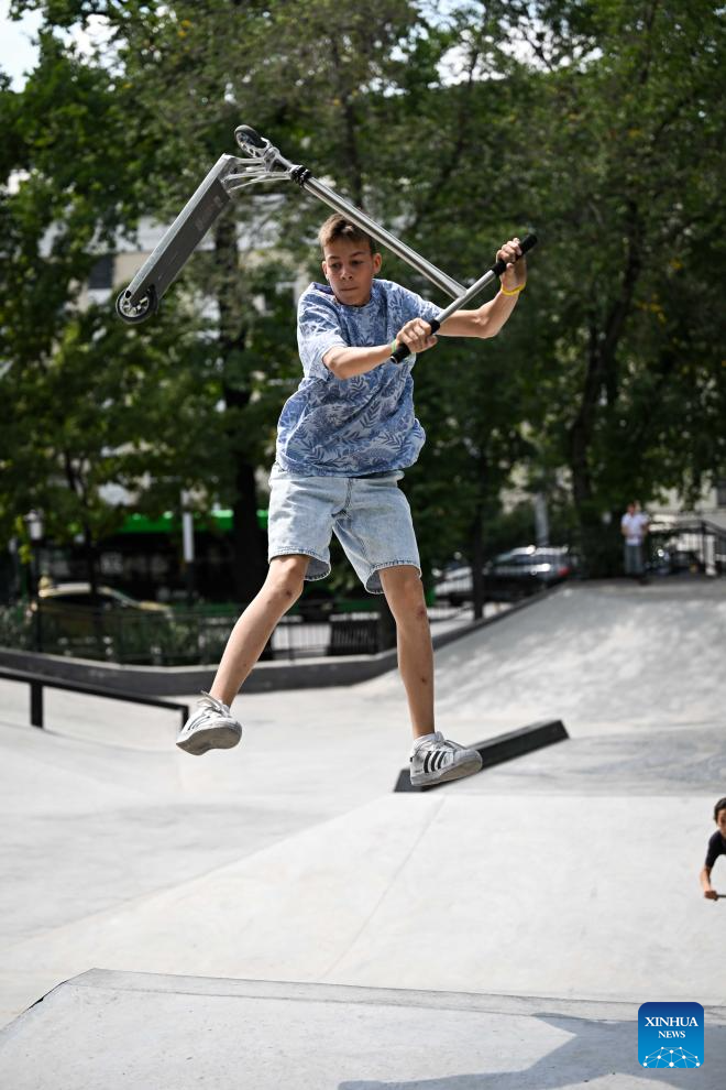 A boy plays a scooter stunt at a sports park in Almaty, Kazakhstan, on Aug. 3, 2025. (Xinhua/Li Renzi)