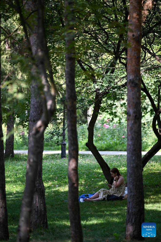 A woman takes a rest at a park in Almaty, Kazakhstan, on Aug. 3, 2025. (Xinhua/Li Renzi)