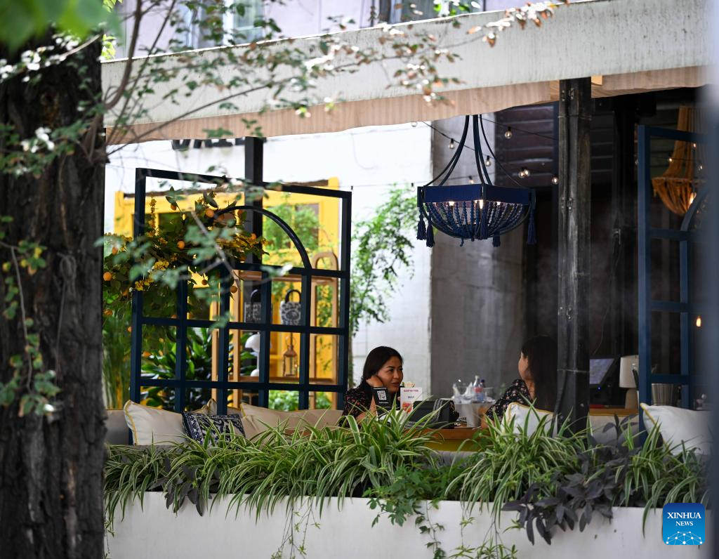 People chat at a cafe in Almaty, Kazakhstan, on Aug. 3, 2025. (Xinhua/Li Renzi)