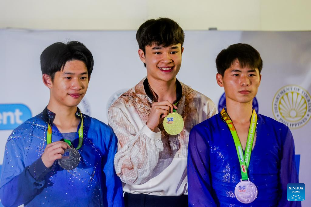 Gold medalist Kim Hyungyeom (C) of South Korea, silver medalist Li Yu-Hsiang (L) of Chinese Taipei and bronze medalist Han Kwang Bom of the Democratic People's Republic of Korea (DPRK) pose during the awarding ceremony for the senior men's skating event at the Asian Open Figure Skating Trophy 2025 in Pasay City, the Philippines, Aug. 5, 2025. (Xinhua/Rouelle Umali)