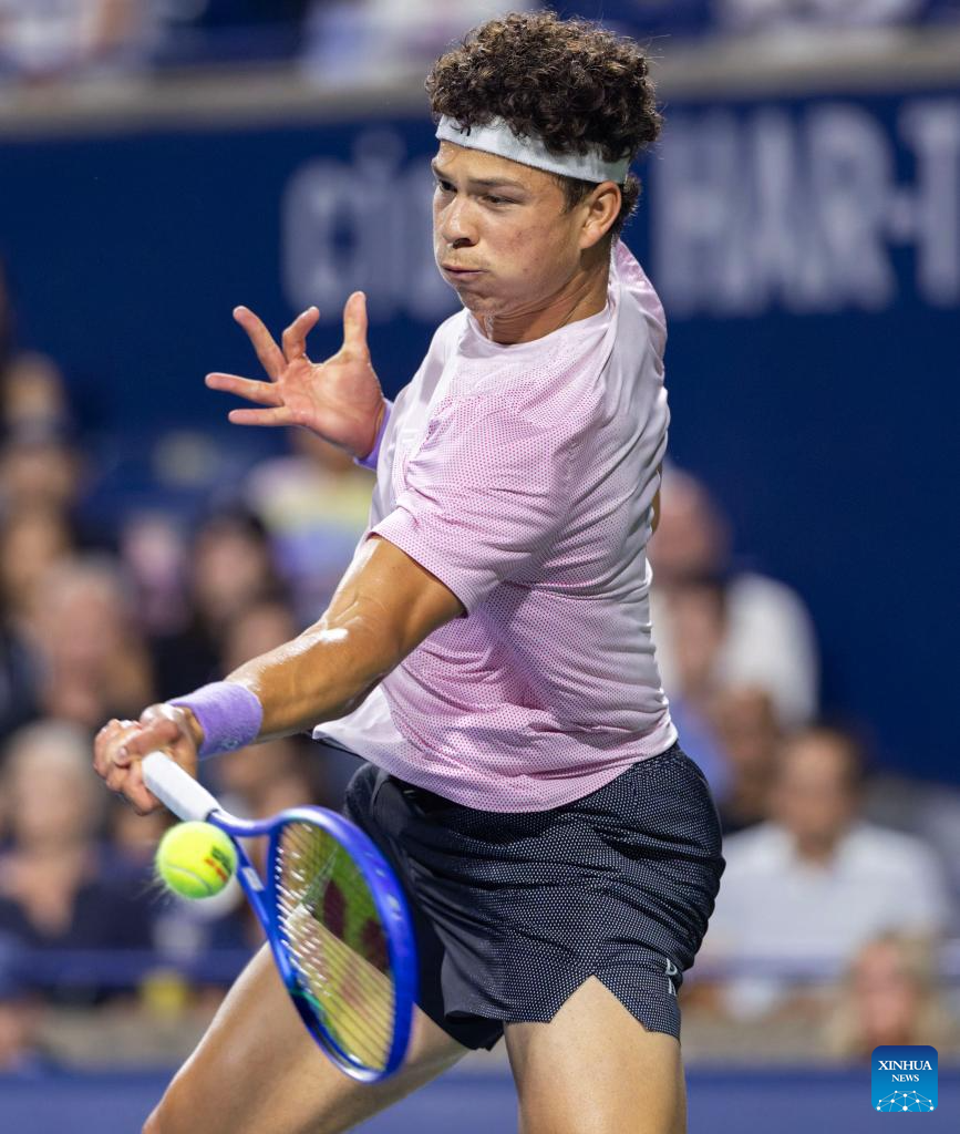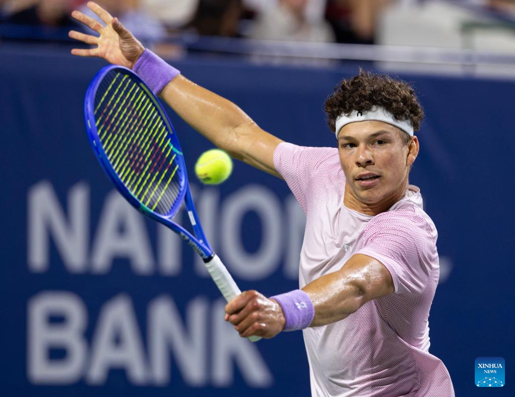 Ben Shelton of the United States returns the ball during the men's singles quarterfinal match between Alex De Minaur of Australia and Ben Shelton of the United States at the 2025 National Bank Open tennis tournament in Toronto, Canada, on Aug. 5, 2025. (Photo by Zou Zheng/Xinhua)