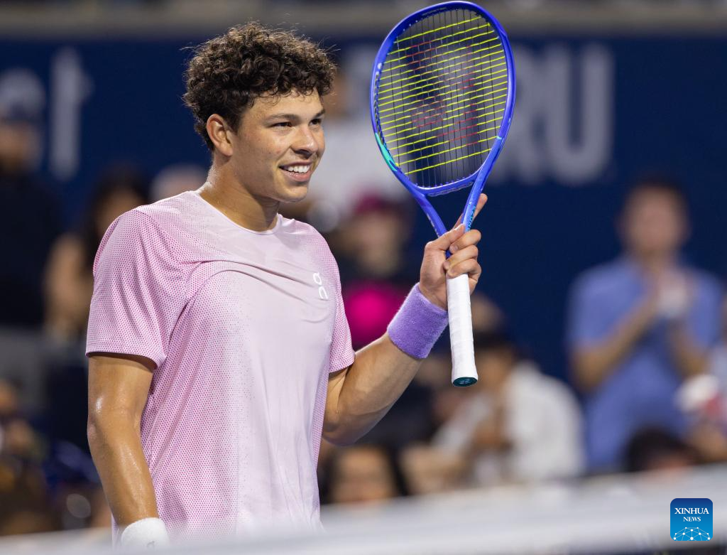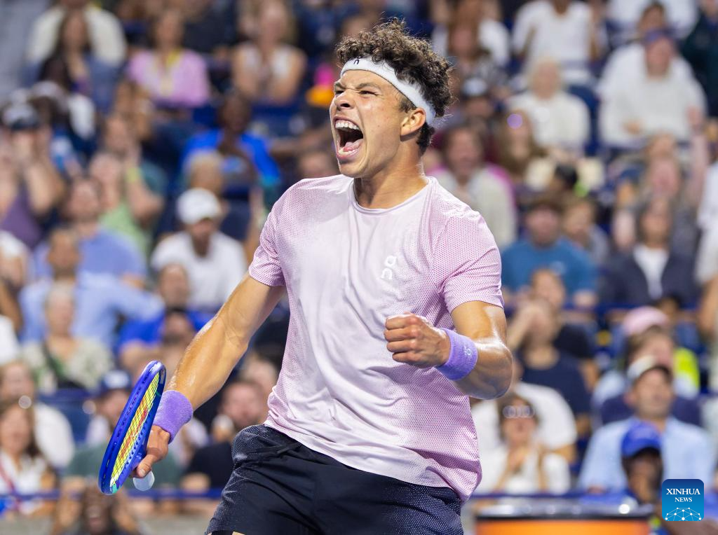 Ben Shelton of the United States celebrates victory during the men's singles quarterfinal match between Alex De Minaur of Australia and Ben Shelton of the United States at the 2025 National Bank Open tennis tournament in Toronto, Canada, on Aug. 5, 2025. (Photo by Zou Zheng/Xinhua)