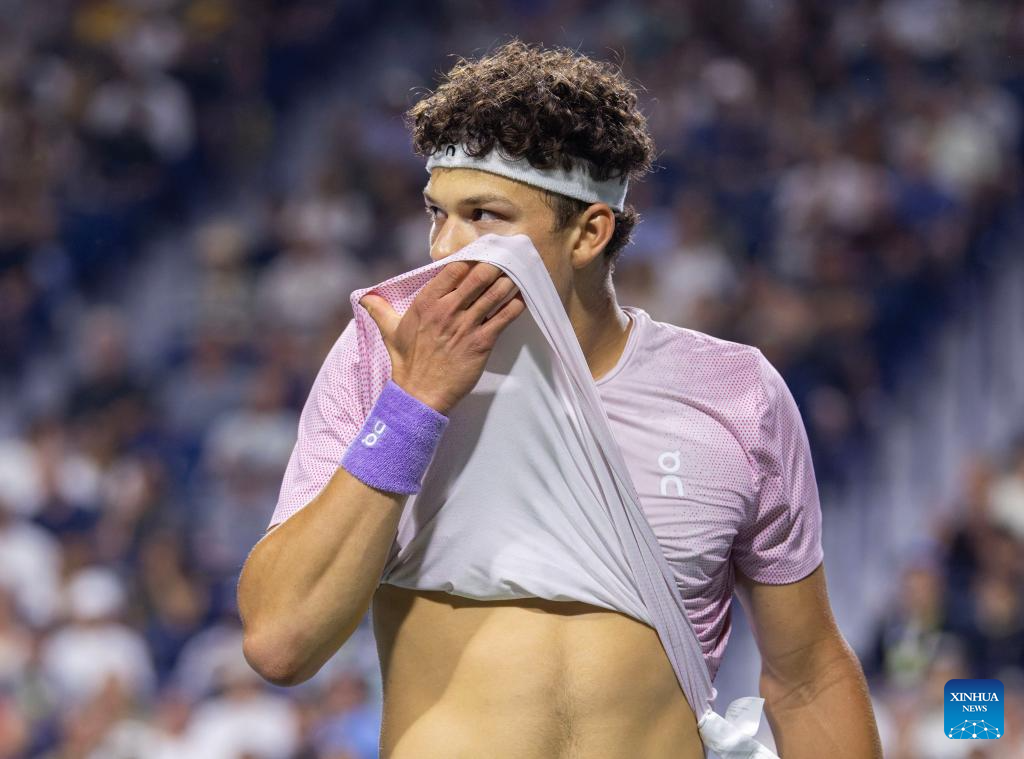 Ben Shelton of the United States reacts during the men's singles quarterfinal match between Alex De Minaur of Australia and Ben Shelton of the United States at the 2025 National Bank Open tennis tournament in Toronto, Canada, on Aug. 5, 2025. (Photo by Zou Zheng/Xinhua)