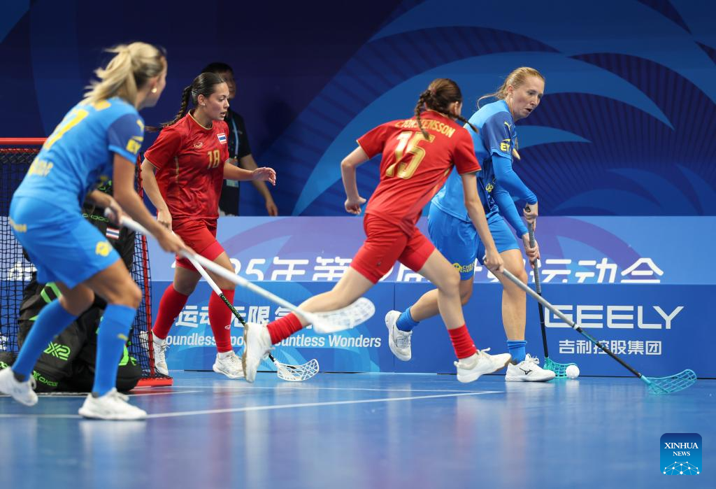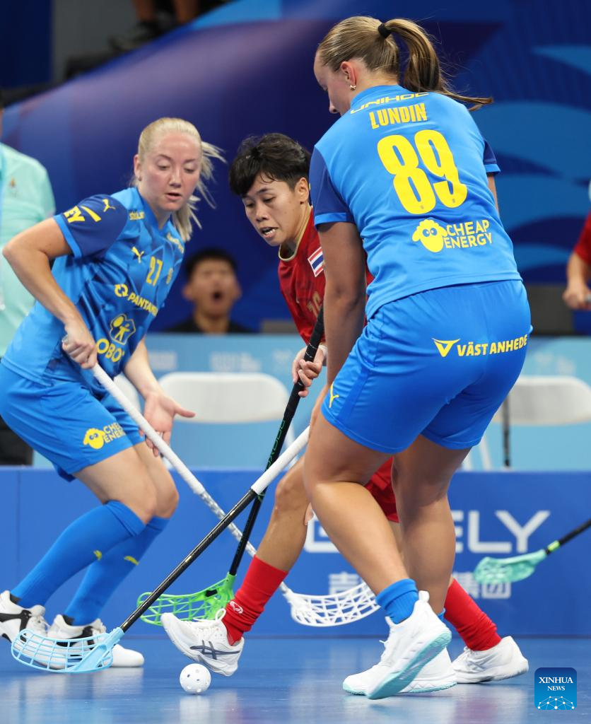 Praphaphon Bunsuk (C) of Thailand vies with Ellen Lundin (R) of Sweden during the women's preliminary round Group A match between Thailand and Sweden of Floorball at the World Games 2025 in Chengdu, southwest China's Sichuan Province, Aug. 6, 2025. (Xinhua/Zhang Liyun)