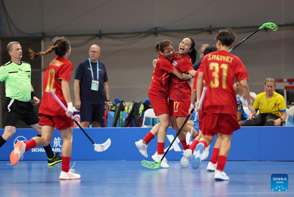 Rungnapa Kebsomrong (5th L) of Thailand celebrates scoring with her teammates during the women's preliminary round Group A match between Thailand and Sweden of Floorball at the World Games 2025 in Chengdu, southwest China's Sichuan Province, Aug. 6, 2025. (Xinhua/Zhang Liyun)
