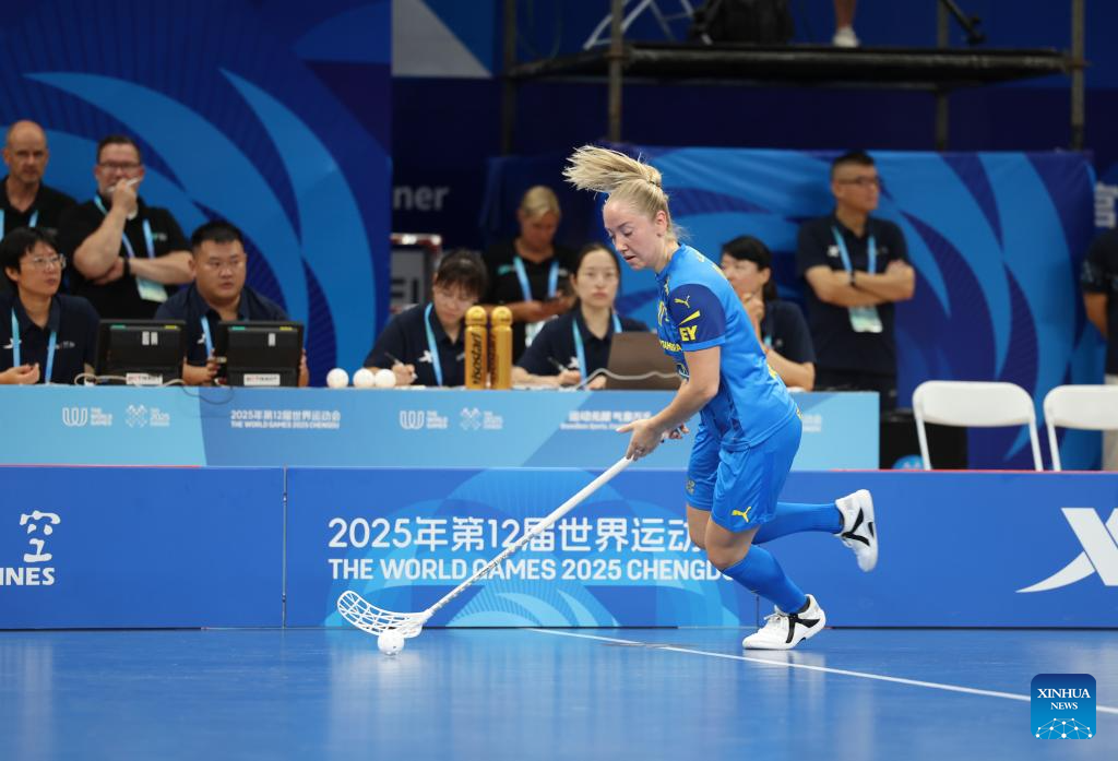 Moa Andersson of Sweden drives the ball during the women's preliminary round Group A match between Thailand and Sweden of Floorball at the World Games 2025 in Chengdu, southwest China's Sichuan Province, Aug. 6, 2025. (Xinhua/Zhang Liyun)