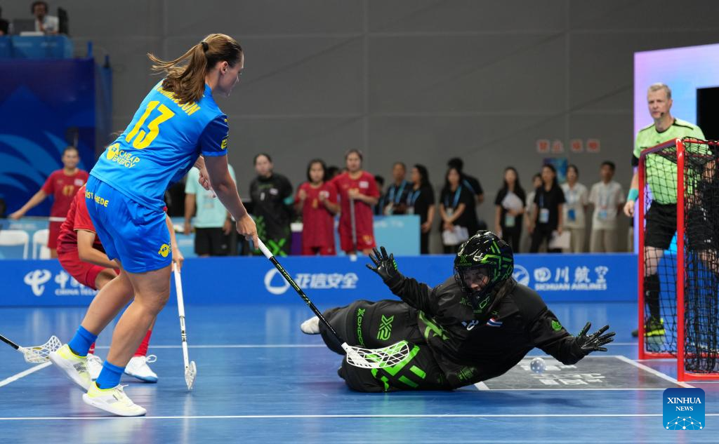 Wilma Johansson (L) of Sweden shoots and scores during the women's preliminary round Group A match between Thailand and Sweden of Floorball at the World Games 2025 in Chengdu, southwest China's Sichuan Province, Aug. 6, 2025. (Xinhua/Li Xulun)