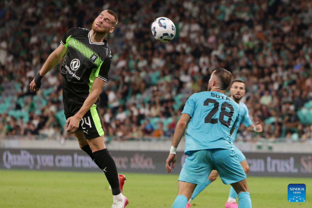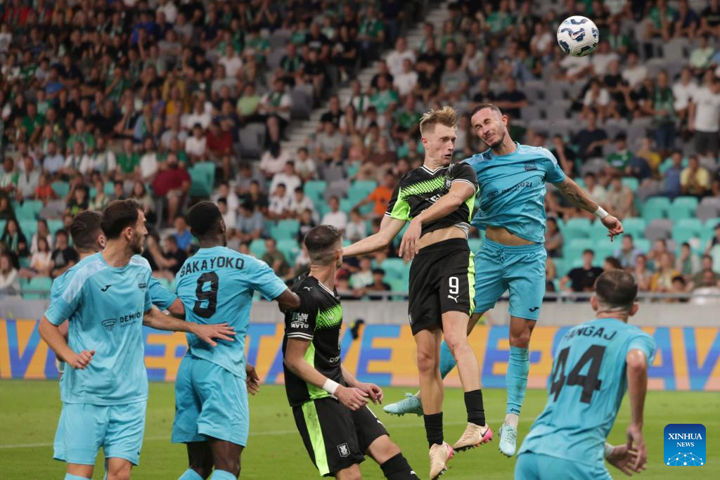 Alex Tamm (top L) of Olimpija competes for a header during the third qualifying round match between Olimpija of Slovenia and Egnatia of Albania at the UEFA Conference League in Ljubljana, Slovenia, Aug. 7, 2025. (Photo by Zeljko Stevanic/Xinhua)