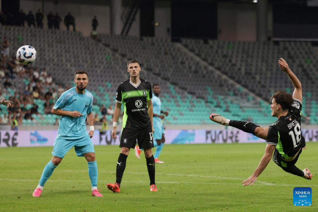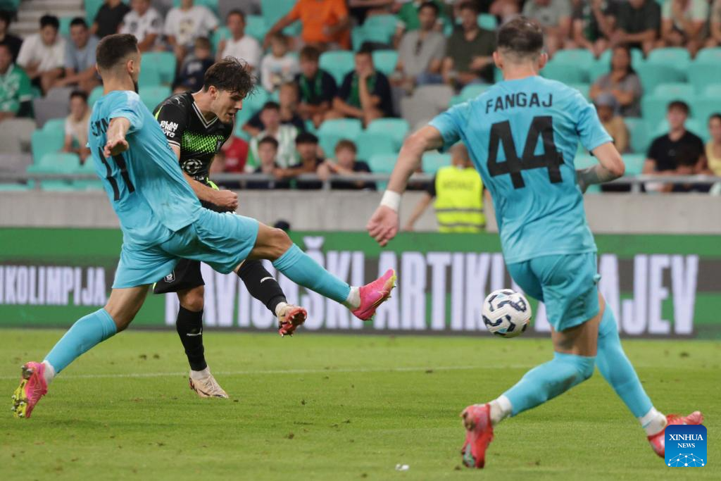 Marko Brest (R) of Olimpija shoots during the third qualifying round match between Olimpija of Slovenia and Egnatia of Albania at the UEFA Conference League in Ljubljana, Slovenia, Aug. 7, 2025. (Photo by Zeljko Stevanic/Xinhua)