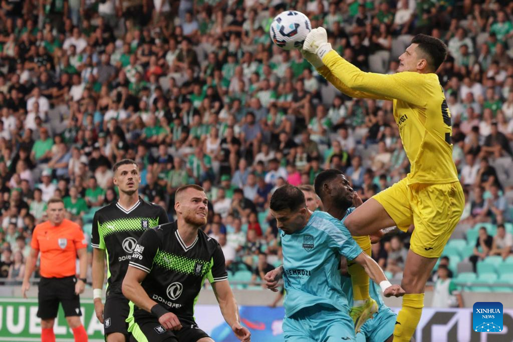 Egnatia's goalkeeper Mario Dajsinani (1st R) makes a save during the third qualifying round match between Olimpija of Slovenia and Egnatia of Albania at the UEFA Conference League in Ljubljana, Slovenia, Aug. 7, 2025. (Photo by Zeljko Stevanic/Xinhua)
