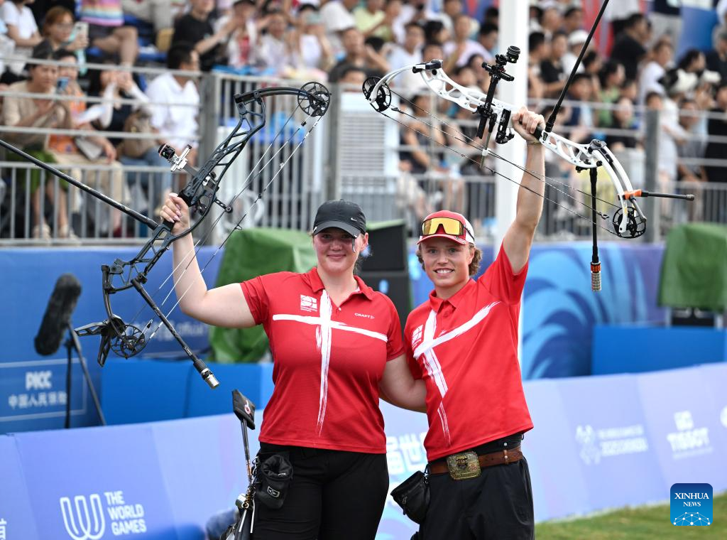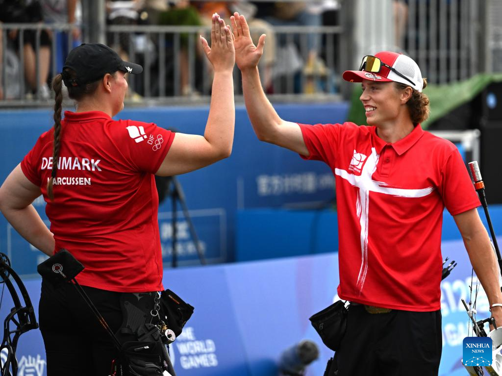 Mathias Bertrand Fullerton (R)/Sofie Louise Dam Marcussen of Denmark celebrate after the mixed team compound gold medal match between Denmark and Mexico of Target Archery event at the World Games 2025 in Chengdu, southwest China's Sichuan Province, Aug. 8, 2025. (Xinhua/Li Jianan)