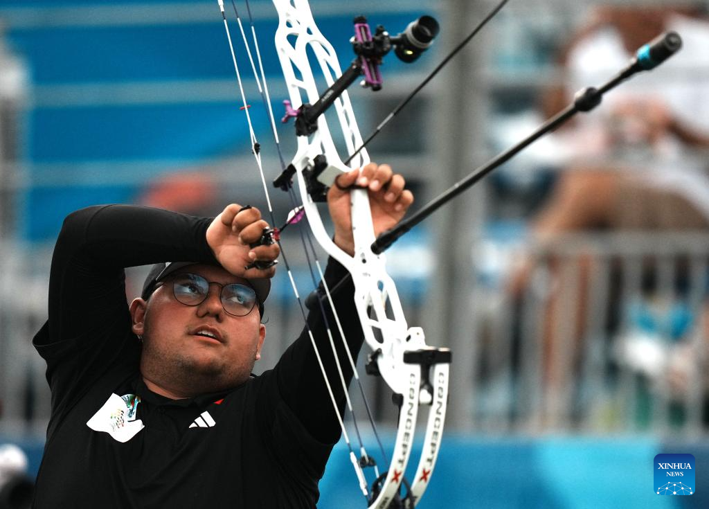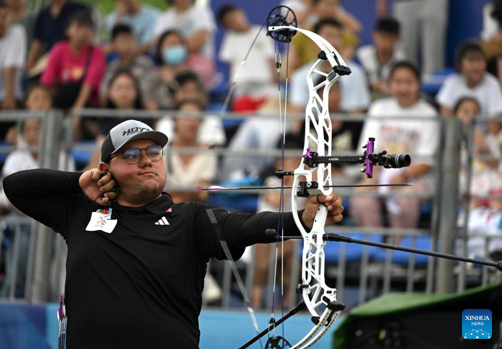 Sebastian Garcia Flores of Mexico competes during the mixed team compound semifinal match between the United States and Mexico of Target Archery event at the World Games 2025 in Chengdu, southwest China's Sichuan Province, Aug. 8, 2025. (Xinhua/Li Jianan)