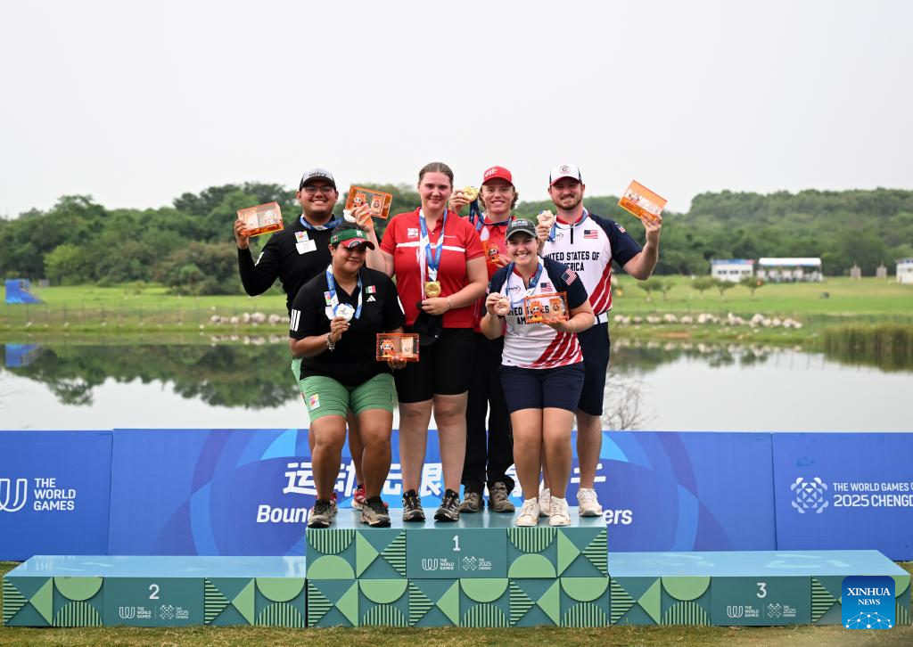 Gold medalists Mathias Bertrand Fullerton (2nd R, back)/Sofie Louise Dam Marcussen (2nd L, back) of Denmark, silver medalists Sebastian Garcia Flores (1st L, back)/Andrea Maya Becerra Arizaga (L front) of Mexico and bronze medalists Alexis Mercedes Ruiz (R front)/Curtis Lee Broadnax of the United States pose during the awarding ceremony for the mixed team compound match of Target Archery event at the World Games 2025 in Chengdu, southwest China's Sichuan Province, Aug. 8, 2025. (Xinhua/Li Jianan)