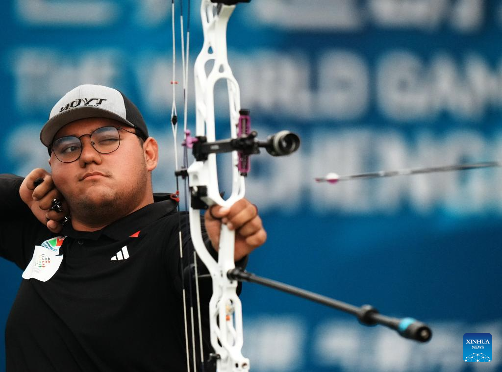 Sebastian Garcia Flores of Mexico competes during the mixed team compound gold medal match between Denmark and Mexico of Target Archery event at the World Games 2025 in Chengdu, southwest China's Sichuan Province, Aug. 8, 2025. (Xinhua/Li Jianan)