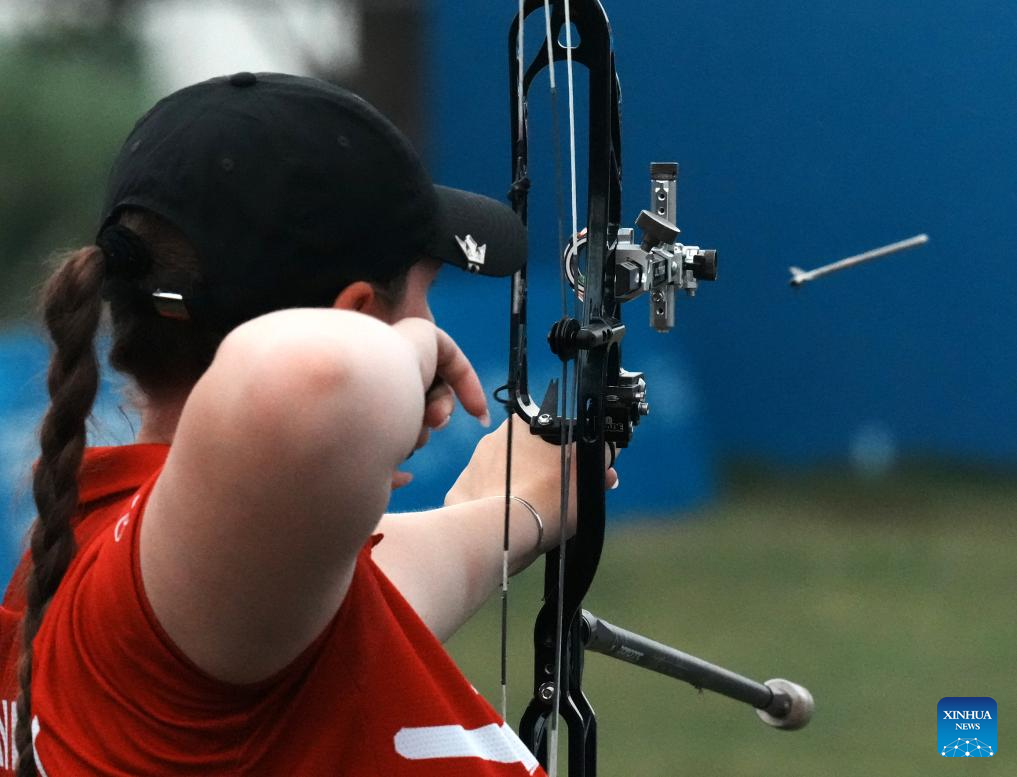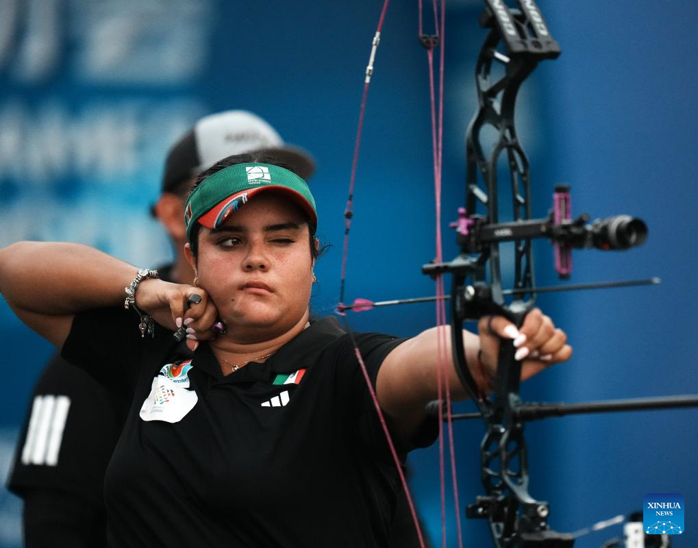Andrea Maya Becerra Arizaga of Mexico competes during the mixed team compound gold medal match between Denmark and Mexico of Target Archery event at the World Games 2025 in Chengdu, southwest China's Sichuan Province, Aug. 8, 2025. (Xinhua/Li Jianan)