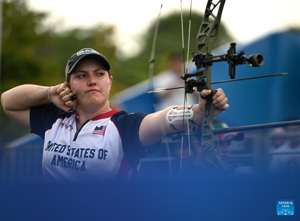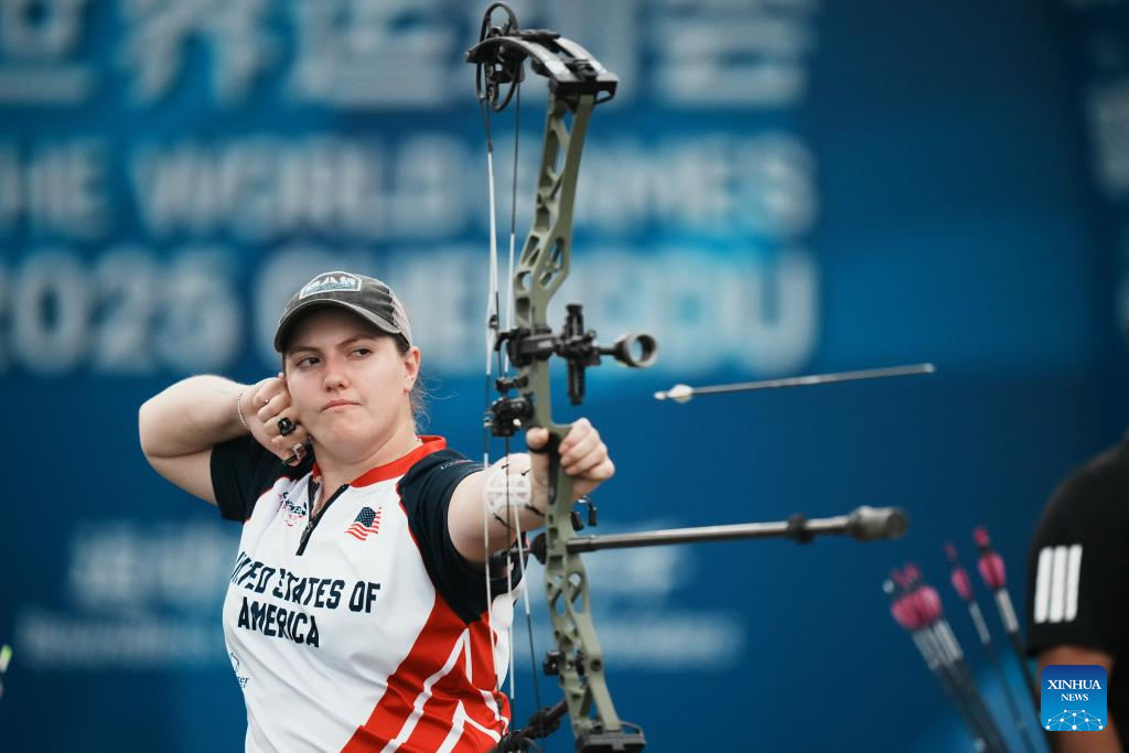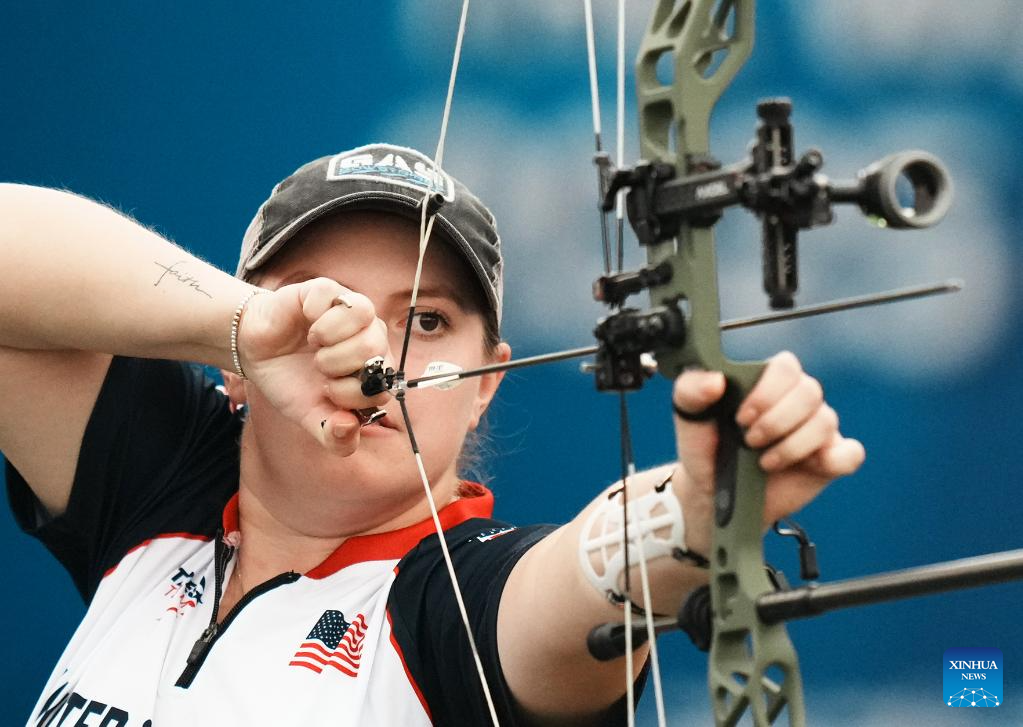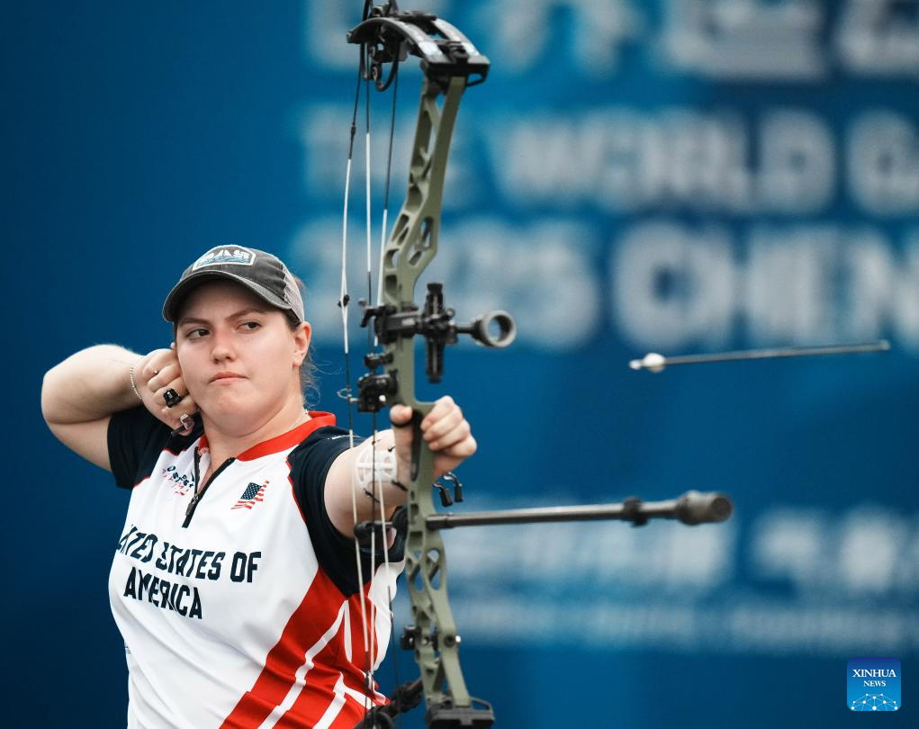 Alexis Mercedes Ruiz of the United States competes during the mixed team compound semifinal match between the United States and Mexico of Target Archery event at the World Games 2025 in Chengdu, southwest China's Sichuan Province, Aug. 8, 2025. (Xinhua/Li Jianan)