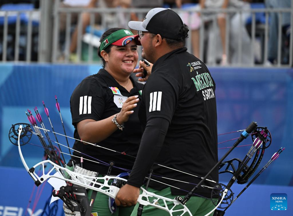 Sebastian Garcia Flores (R)/Andrea Maya Becerra Arizaga of Mexico celebrate after the mixed team compound semifinal match between the United States and Mexico of Target Archery event at the World Games 2025 in Chengdu, southwest China's Sichuan Province, Aug. 8, 2025. (Xinhua/Li Jianan)