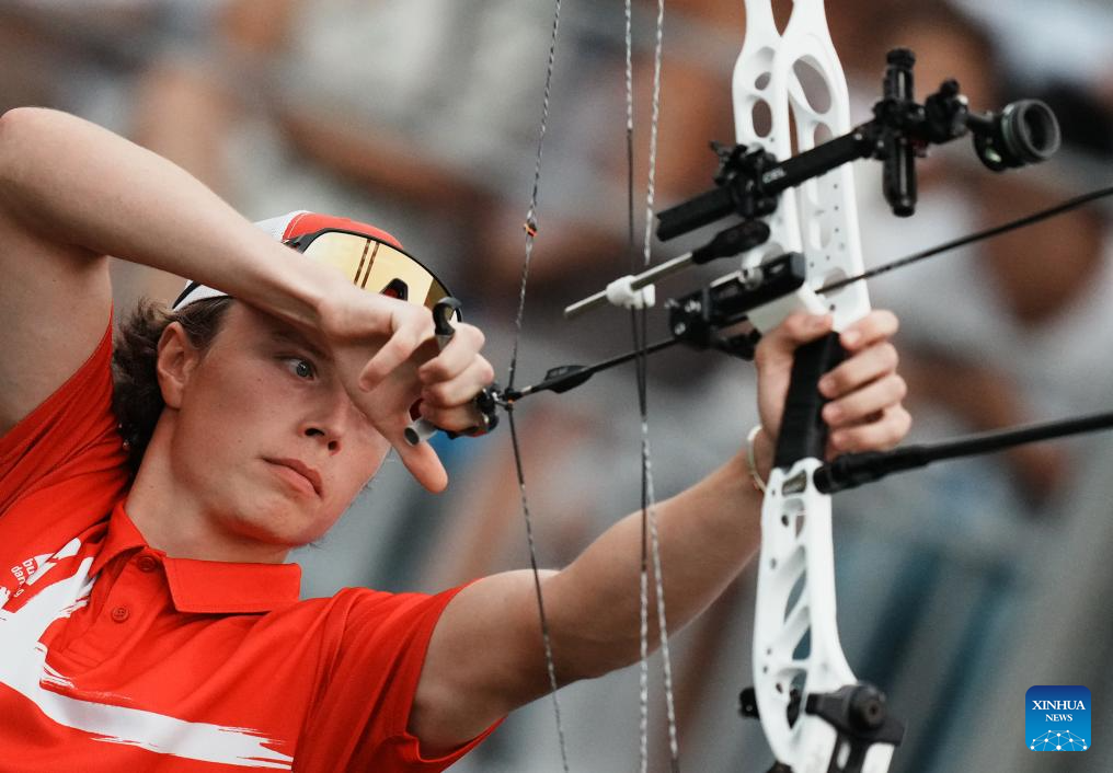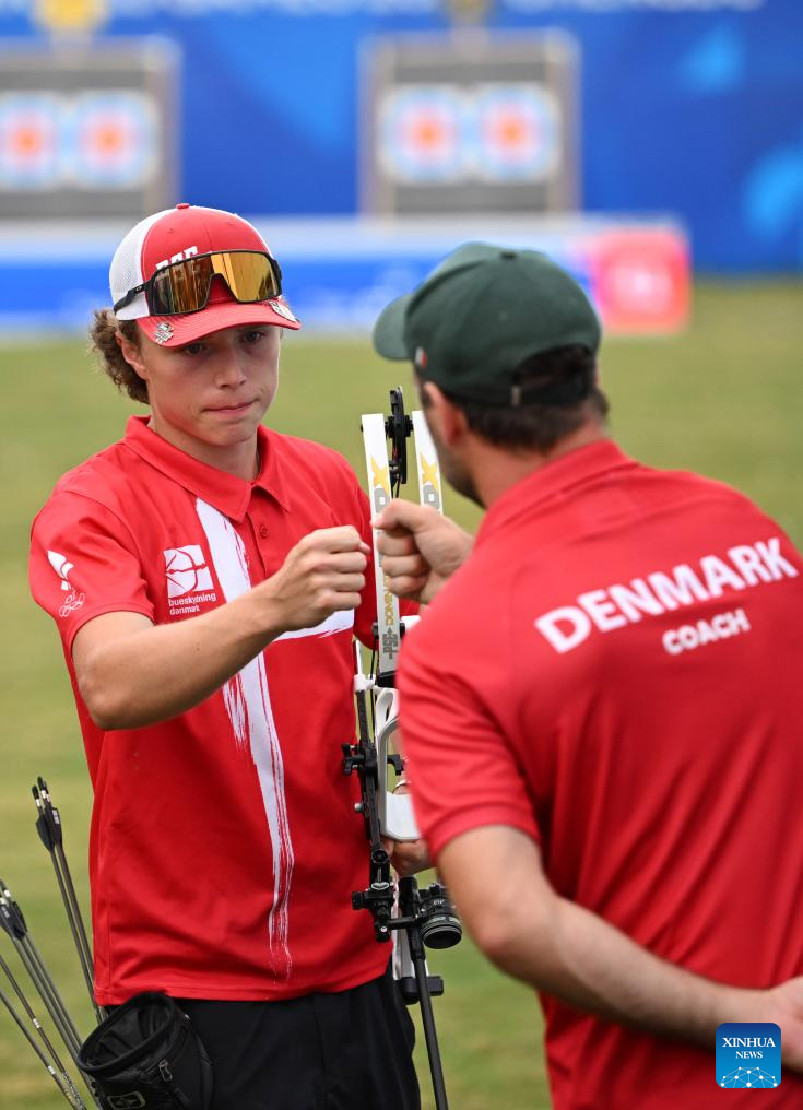 Mathias Bertrand Fullerton of Denmark competes during the mixed team compound gold medal match between Denmark and Mexico of Target Archery event at the World Games 2025 in Chengdu, southwest China's Sichuan Province, Aug. 8, 2025. (Xinhua/Li Jianan)