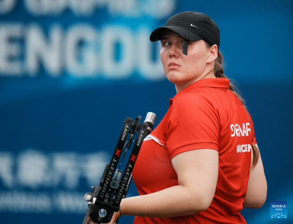 Sofie Louise Dam Marcussen of Denmark competes during the mixed team compound gold medal match between Denmark and Mexico of Target Archery event at the World Games 2025 in Chengdu, southwest China's Sichuan Province, Aug. 8, 2025. (Xinhua/Li Jianan)
