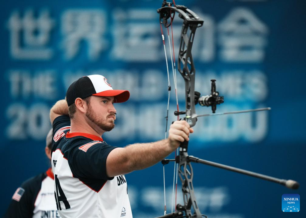 Curtis Lee Broadnax of the United States competes during the mixed team compound bronze medal match between the United States and South Korea of Target Archery event at the World Games 2025 in Chengdu, southwest China's Sichuan Province, Aug. 8, 2025. (Xinhua/Li Jianan)