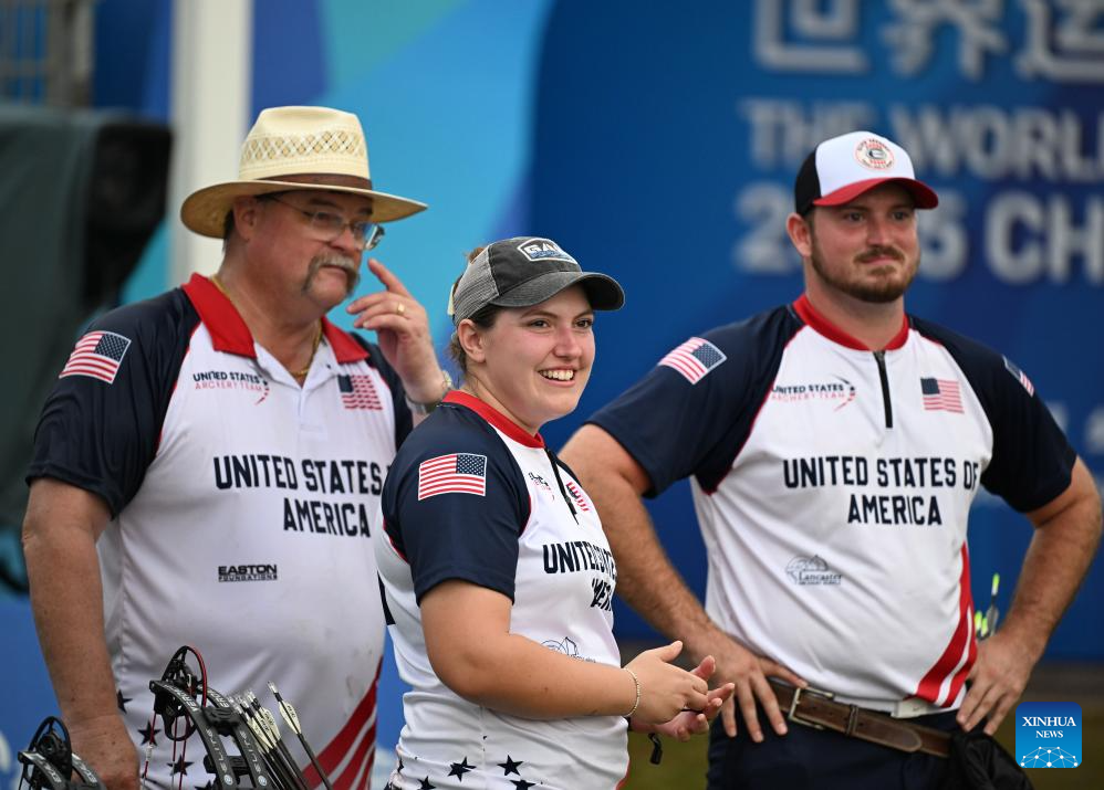 Curtis Lee Broadnax (R)/Alexis Mercedes Ruiz (C) of the United States react during the mixed team compound bronze medal match between the United States and South Korea of Target Archery event at the World Games 2025 in Chengdu, southwest China's Sichuan Province, Aug. 8, 2025. (Xinhua/Li Jianan)