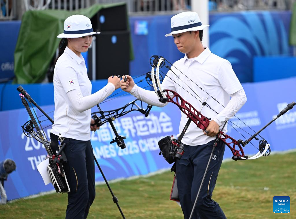 Lee Eunho (R) and Moon Yeeun of South Korea cheer up with each other during the mixed team compound semifinal match between Denmark and South Korea of Target Archery event at the World Games 2025 in Chengdu, southwest China's Sichuan Province, Aug. 8, 2025. (Xinhua/Li Jianan)