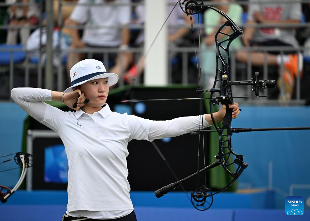Moon Yeeun of South Korea competes during the mixed team compound bronze medal match between the United States and South Korea of Target Archery event at the World Games 2025 in Chengdu, southwest China's Sichuan Province, Aug. 8, 2025. (Xinhua/Li Jianan)
