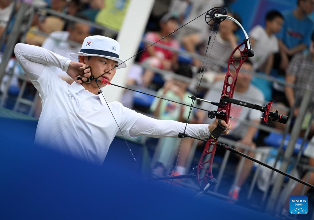 Lee Eunho of South Korea competes during the mixed team compound bronze medal match between the United States and South Korea of Target Archery event at the World Games 2025 in Chengdu, southwest China's Sichuan Province, Aug. 8, 2025. (Xinhua/Li Jianan)