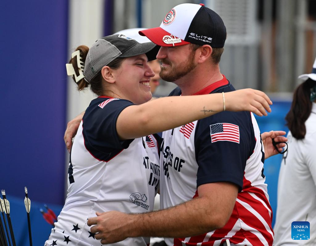 Curtis Lee Broadnax (R) and Alexis Mercedes Ruiz of the United States hug each other after the mixed team compound bronze medal match between the United States and South Korea of Target Archery event at the World Games 2025 in Chengdu, southwest China's Sichuan Province, Aug. 8, 2025. (Xinhua/Li Jianan)