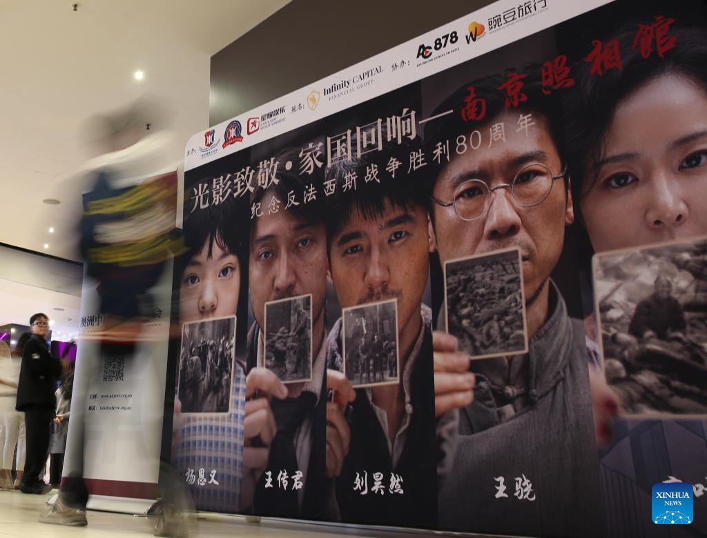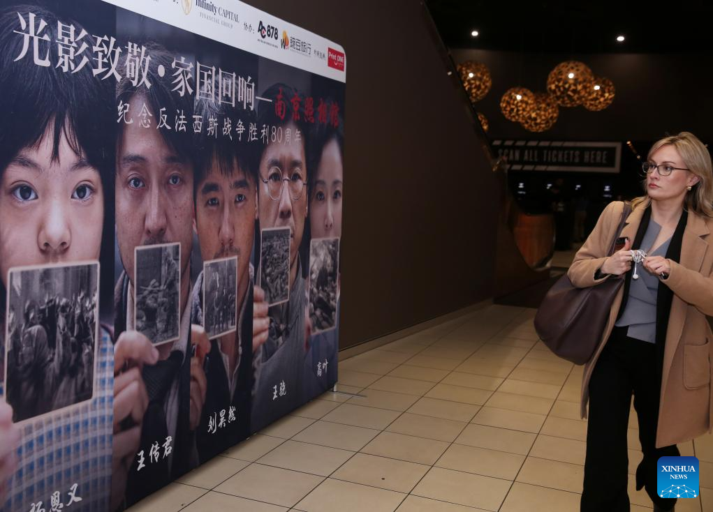 A woman walks past a board of "Dead to Rights" at a cinema in Sydney, Australia, Aug. 8, 2025. "Dead To Rights," a film on the Nanjing Massacre during World War II, was released in Australia on Thursday. (Xinhua/Ma Ping)