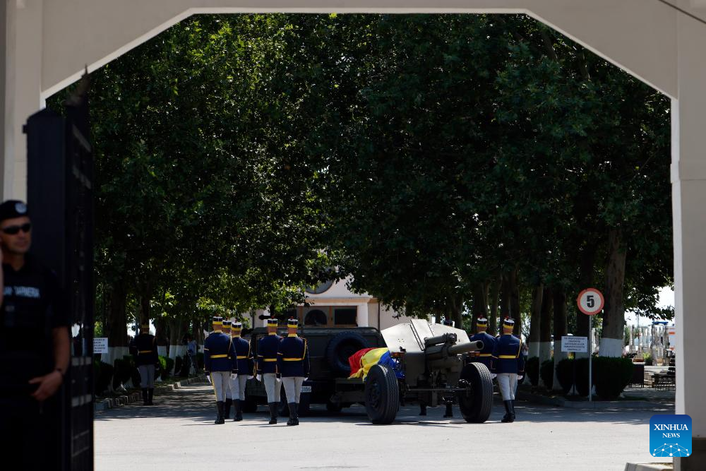 The coffin of Romania's former president Ion Iliescu is carried on a cannon carriage during an official funeral ceremony in Bucharest, Romania, Aug. 7, 2025.