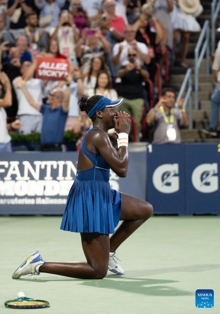Victoria Mboko of Canada reacts after winning the women's singles final match between Victoria Mboko of Canada and Osaka Naomi of Japan at the 2025 National Bank Open tennis tournament in Montreal, Canada, on Aug. 7, 2025. (Photo by Li Haitao/Xinhua)