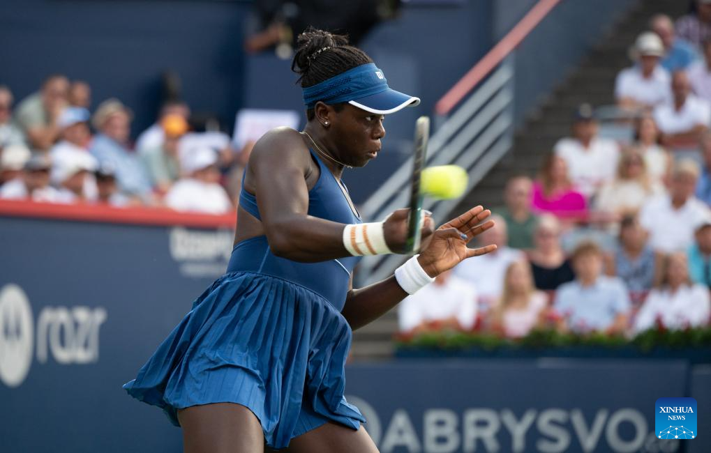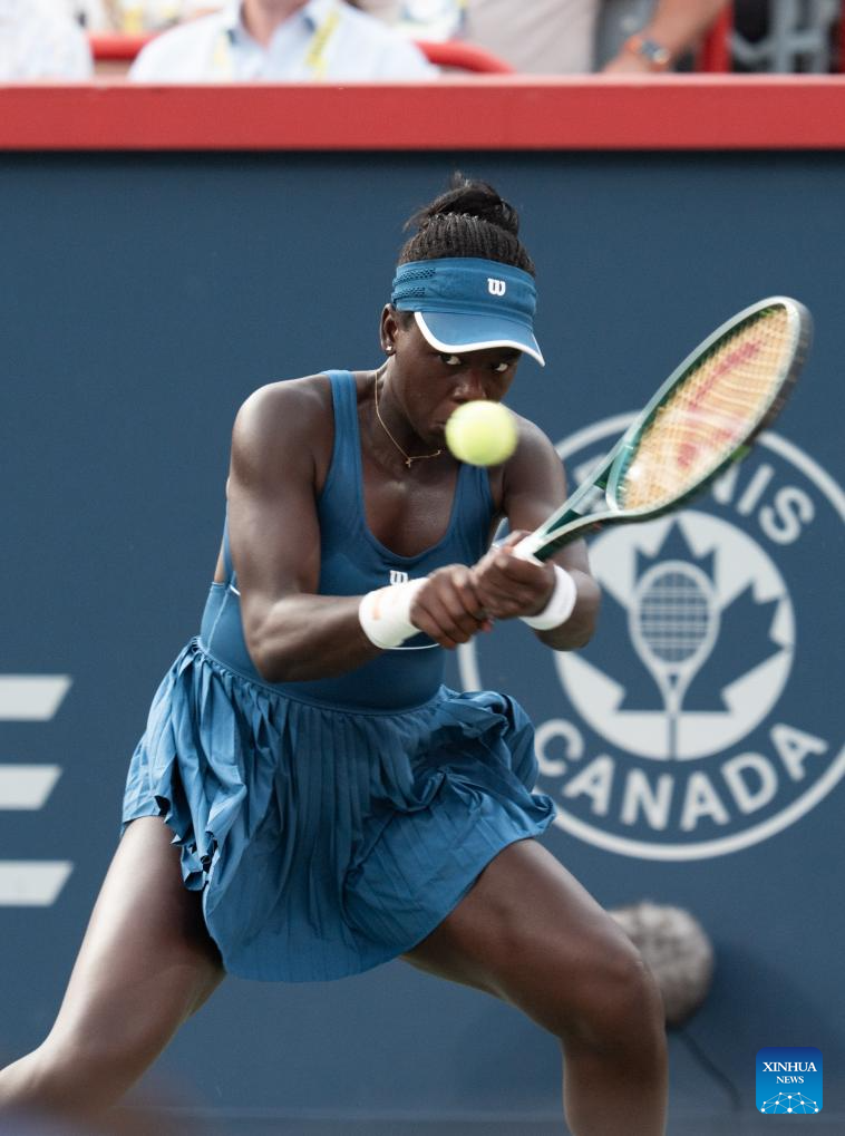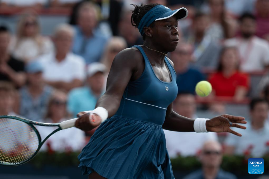 Victoria Mboko of Canada returns the ball during the women's singles final match between Victoria Mboko of Canada and Osaka Naomi of Japan at the 2025 National Bank Open tennis tournament in Montreal, Canada, on Aug. 7, 2025. (Photo by Li Haitao/Xinhua)