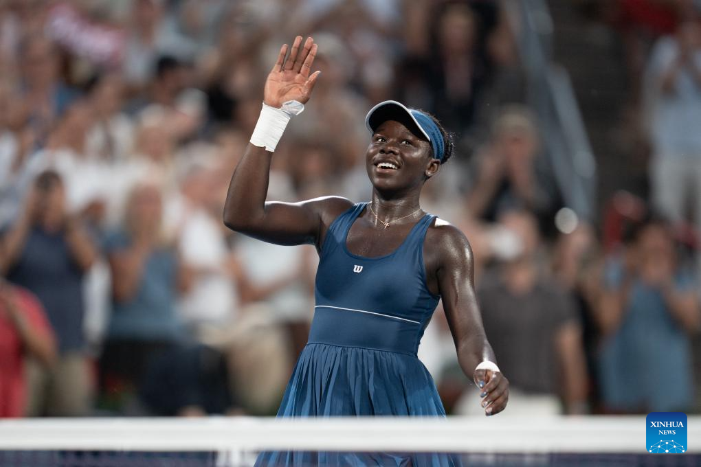 Victoria Mboko of Canada waves to the spectators after winning the women's singles final match between Victoria Mboko of Canada and Osaka Naomi of Japan at the 2025 National Bank Open tennis tournament in Montreal, Canada, on Aug. 7, 2025. (Photo by Li Haitao/Xinhua)