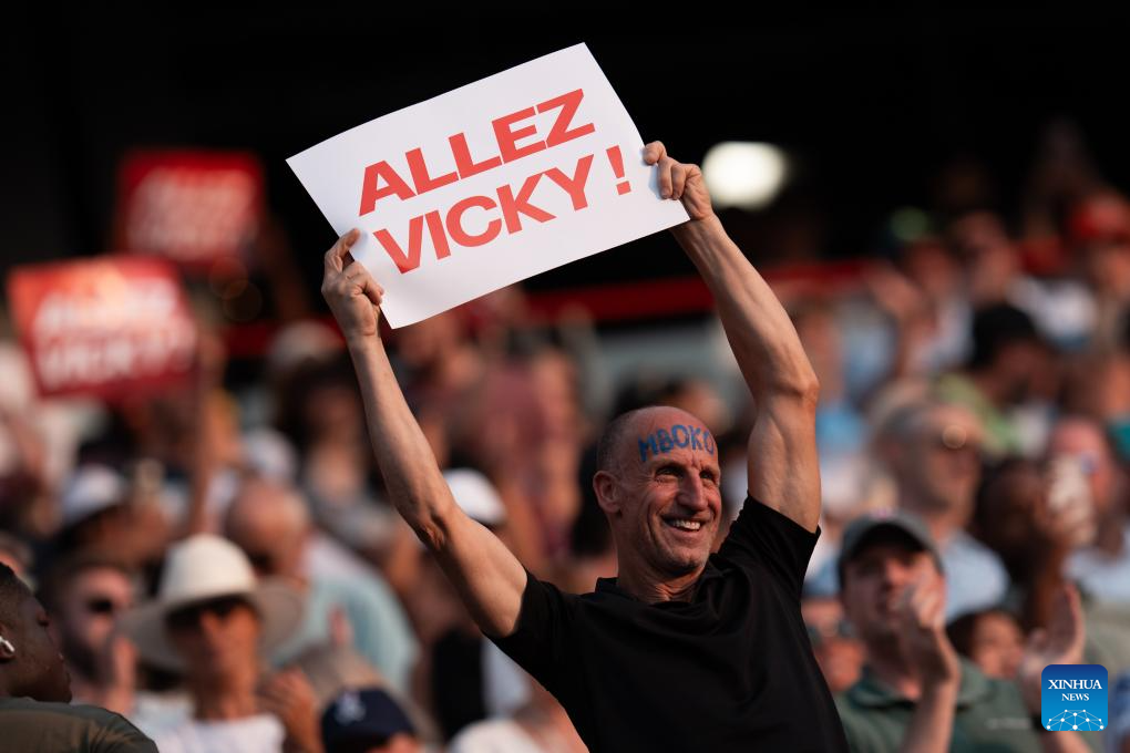 Supporters cheer for Victoria Mboko of Canada during the women's singles final match between Victoria Mboko of Canada and Osaka Naomi of Japan at the 2025 National Bank Open tennis tournament in Montreal, Canada, on Aug. 7, 2025. (Photo by Li Haitao/Xinhua)