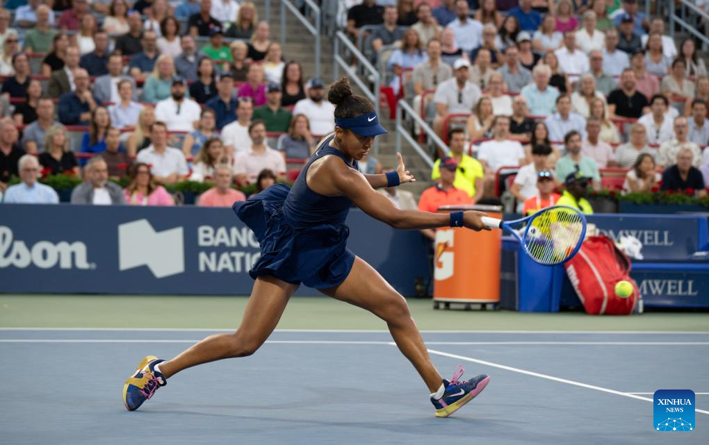 Osaka Naomi of Japan returns the ball during the women's singles final match between Victoria Mboko of Canada and Osaka Naomi of Japan at the 2025 National Bank Open tennis tournament in Montreal, Canada, on Aug. 7, 2025. (Photo by Li Haitao/Xinhua)