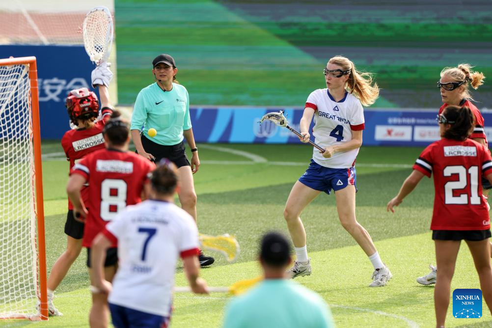 Anna Neville (3rd R) of Britain shoots during the women's preliminary round Group A match between Britain and Canada of Lacrosse event at the World Games 2025 in Chengdu, southwest China's Sichuan Province, Aug. 8, 2025. (Xinhua/Chen Bin)